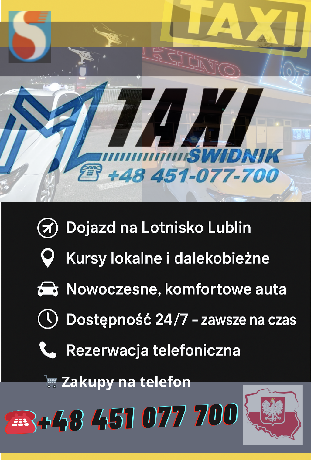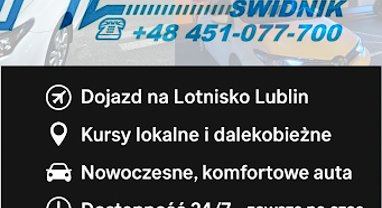M-Taxi Świdnik – całodobowe taxi w Świdniku i okolicach. Oferujemy szybki i wygodny przewóz osób na terenie Świdnika, Lublina, Mełgiewi, Piask i okolicznych miejscowości. Specjalizujemy się w transferach na lotnisko Lublin, zapewniając punktualny i komfortowy dojazd. Nasze taksówki w Świdniku dostępne są 24/7, wystarczy jeden telefon – zawsze przyjedziemy na czas. Oferujemy tanie taxi w Świdniku, przejrzysty cennik i miłą obsługę. Obsługujemy klientów indywidualnych oraz firmy, zapewniamy także dojazdy na dworzec w Lublinie oraz transport z fotelikiem dziecięcym na życzenie. Jeśli potrzebujesz szybkiego i sprawdzonego taxi w Świdniku lub na lotnisko Lublin – wybierz M-Taxi Świdnik - Zadzwoń teraz: ☎️ +48 451 077 700